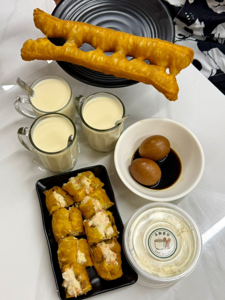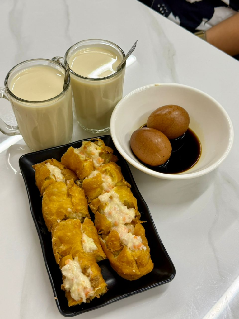 在餐点方面,店内主打多款经典台式早餐组合。其中,豆浆口感顺滑、甜度适中;油条则现点现做,外酥内软;豆腐花细腻绵滑,入口即化。此外,茶叶蛋经过长时间卤制,茶香与卤香融合,成为不少顾客的必点选择。